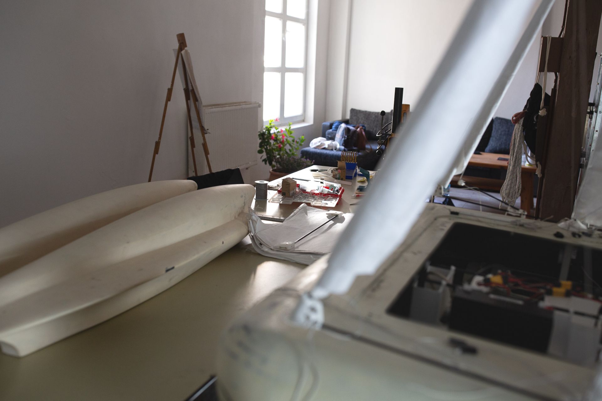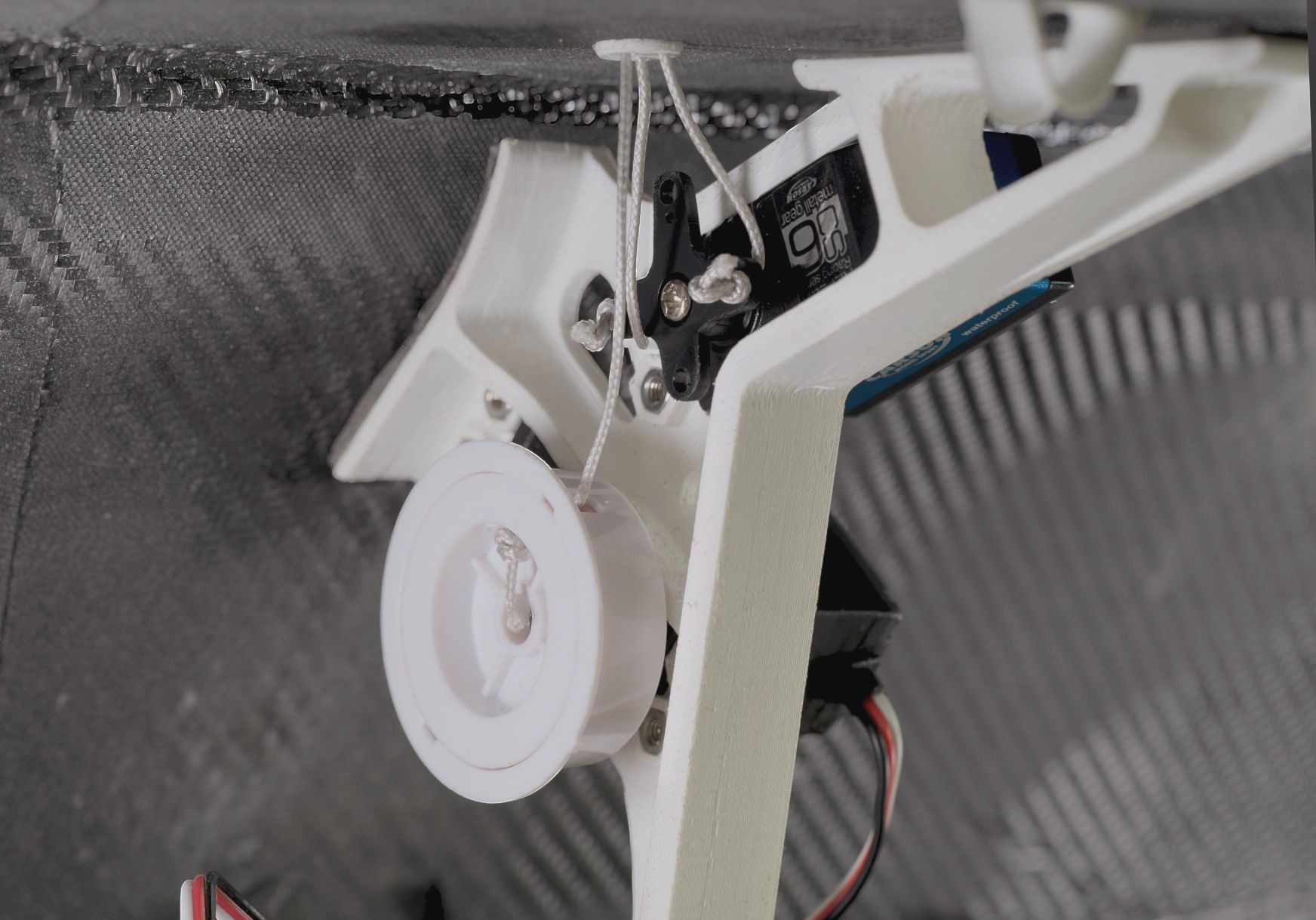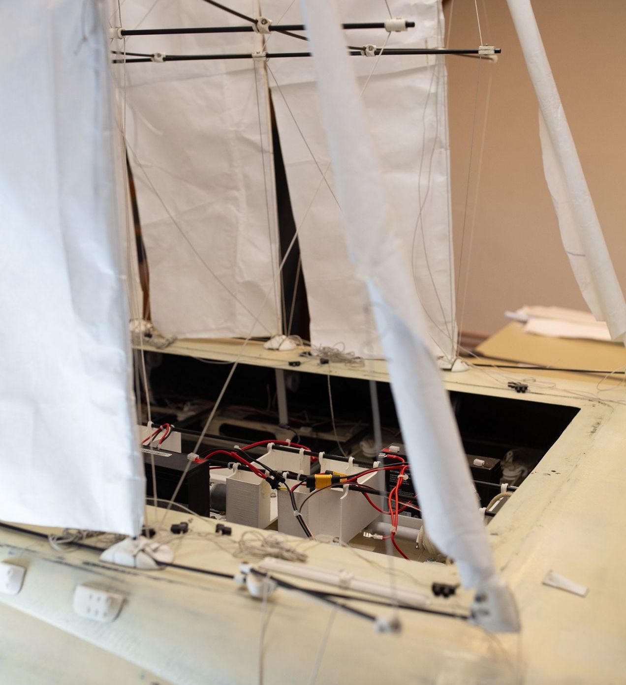 Every mast has its individuell set of servos and whinches to provide precise sale shape control. The test prgram includes also feedback loops between rudder angle, heel angle and sail trim in order to analize the dynaimcs of the boat and optimizng the configuration.