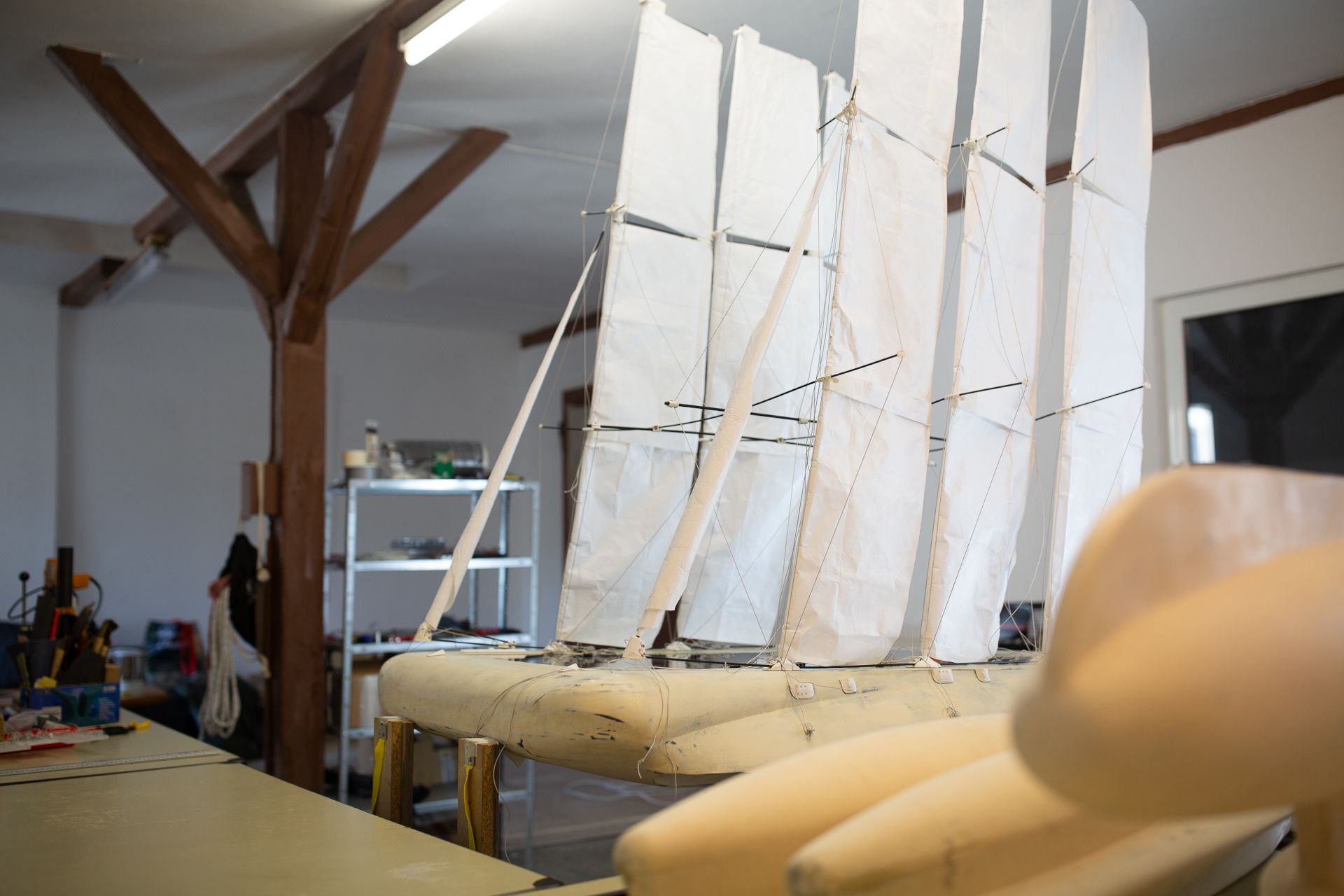 The technical delevopment process started with the fundamental sailing concept of creating righting moment by shifting mass to the weather side. The maximum force which can be transmitted from the wind to the boat depends on this righting moment. We will utilize 300t of payload in order to maximize the available driving force. But that´s only the beginning...